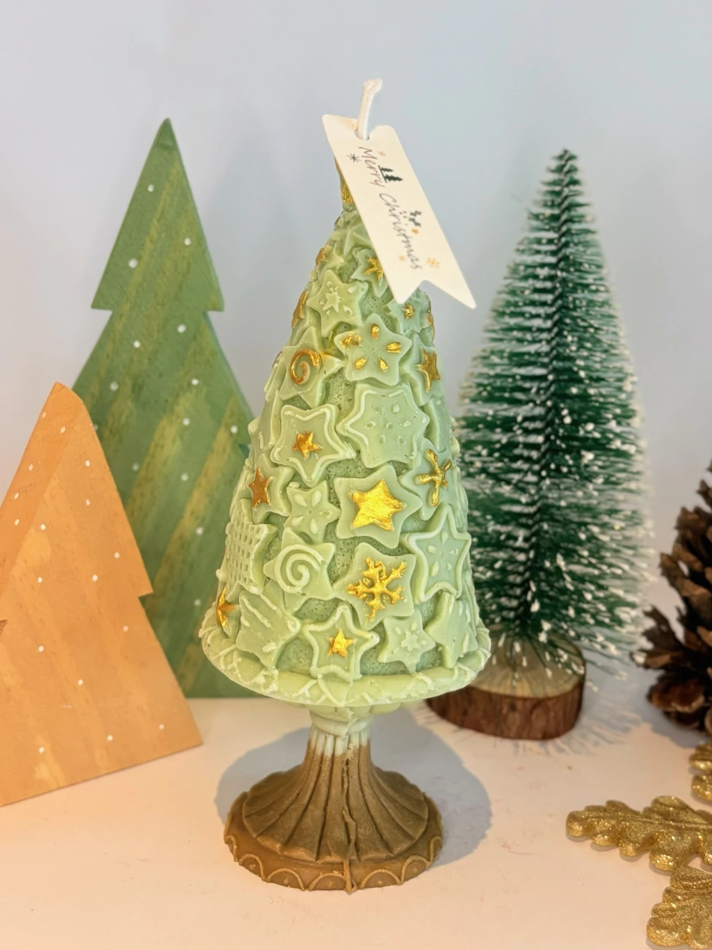 A Vela Pinheiro Estrelado é a peça que rouba a cena na decoração natalina. Feita artesanalmente e pintada à mão, ela traz estrelas, laços e detalhes dourados que remetem ao brilho e à magia do Natal.